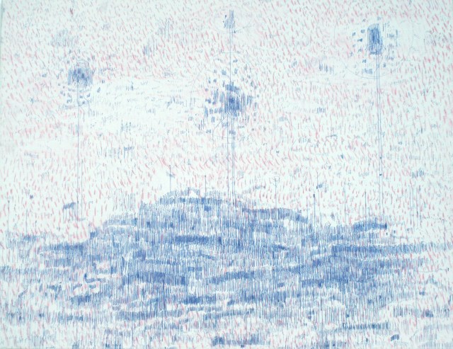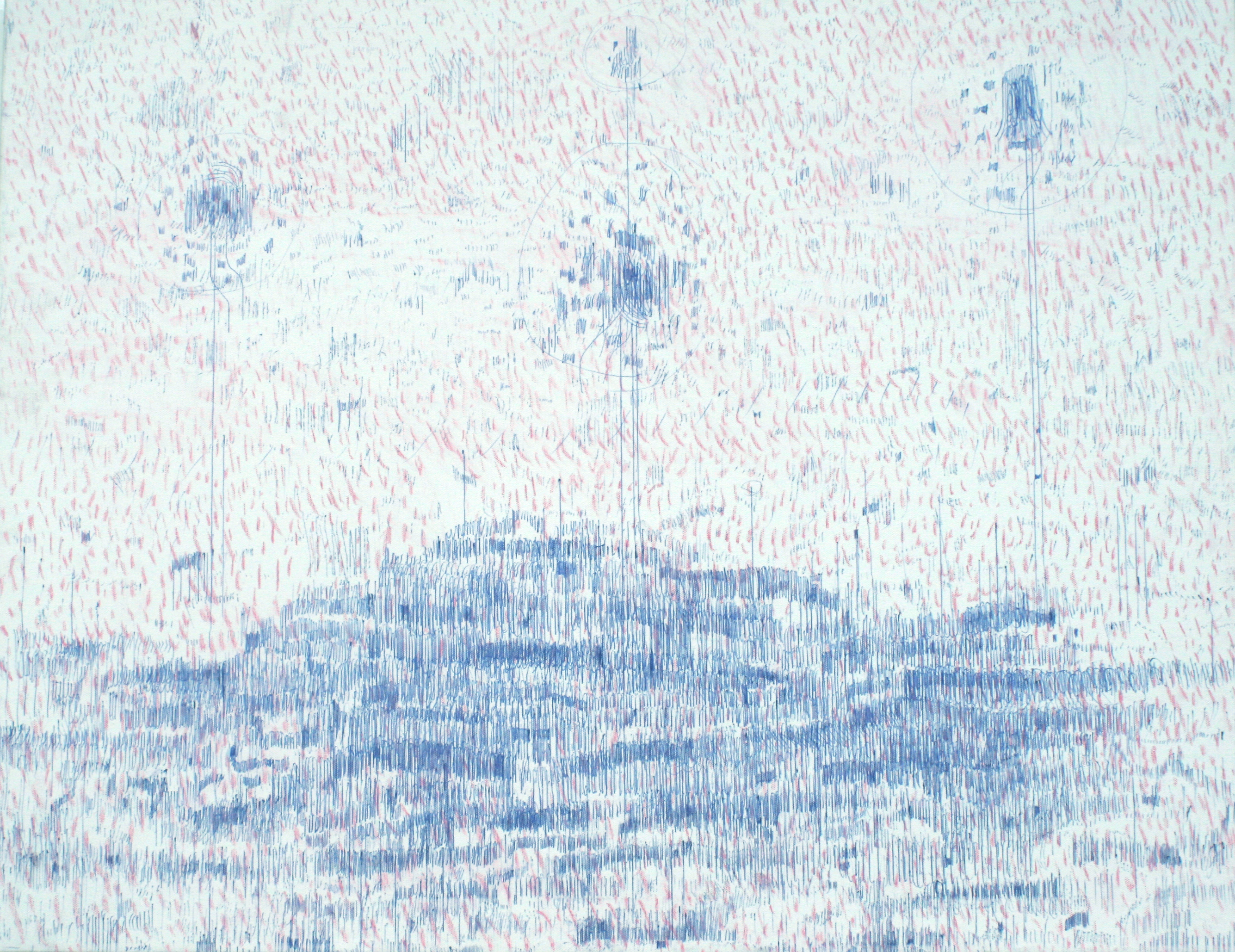 This work was made with biro pen and pink crayon on canvas. The arrangement of marks resemble a mountain landscape with transmitters or swarms of hovering flies.