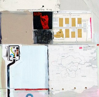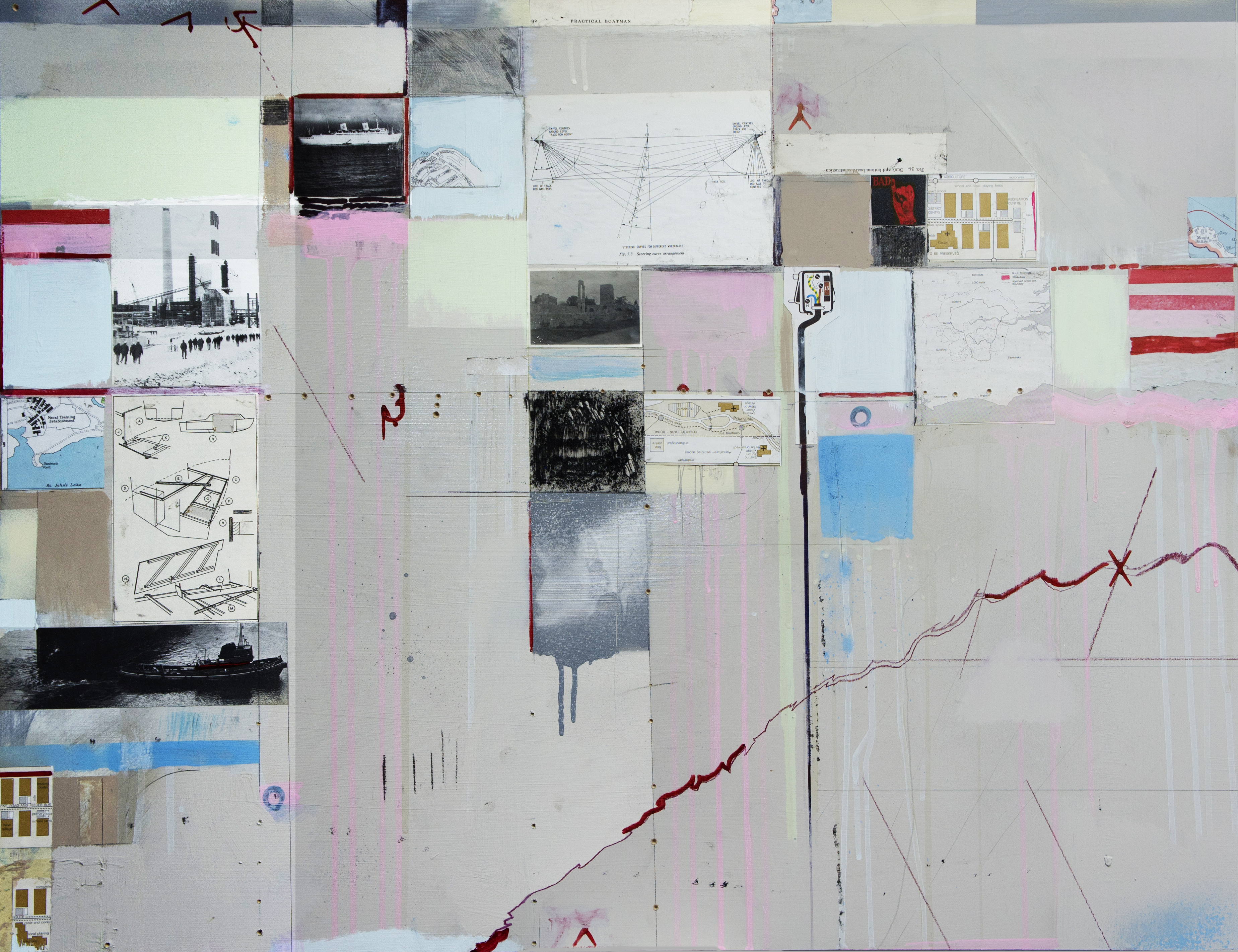 I have been working on this piece in the past few weeks. Found images and diagrams interplay with various types of paint, felt tip and pencil on this wooden surface. Drips are welcome. Ruled and freehand lines and drill marks plot the composition.