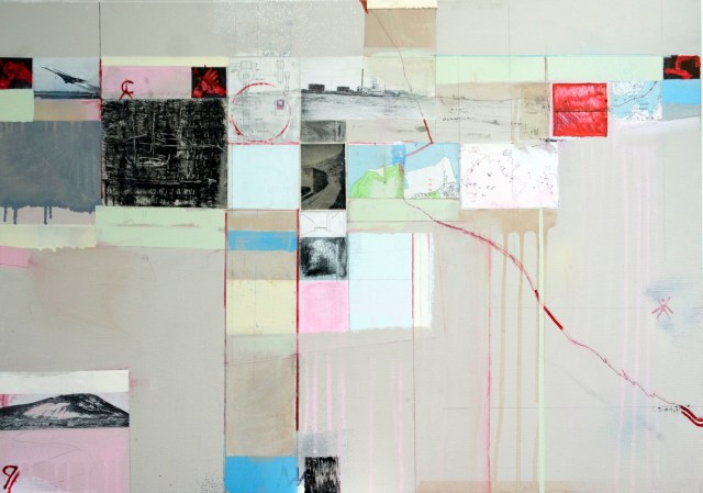 I’ve been building up a body of work of several pieces on grey wood and canvas in the past couple of months. Ambiguous imagery implies adventure and desolation playing around with the paint and lines.