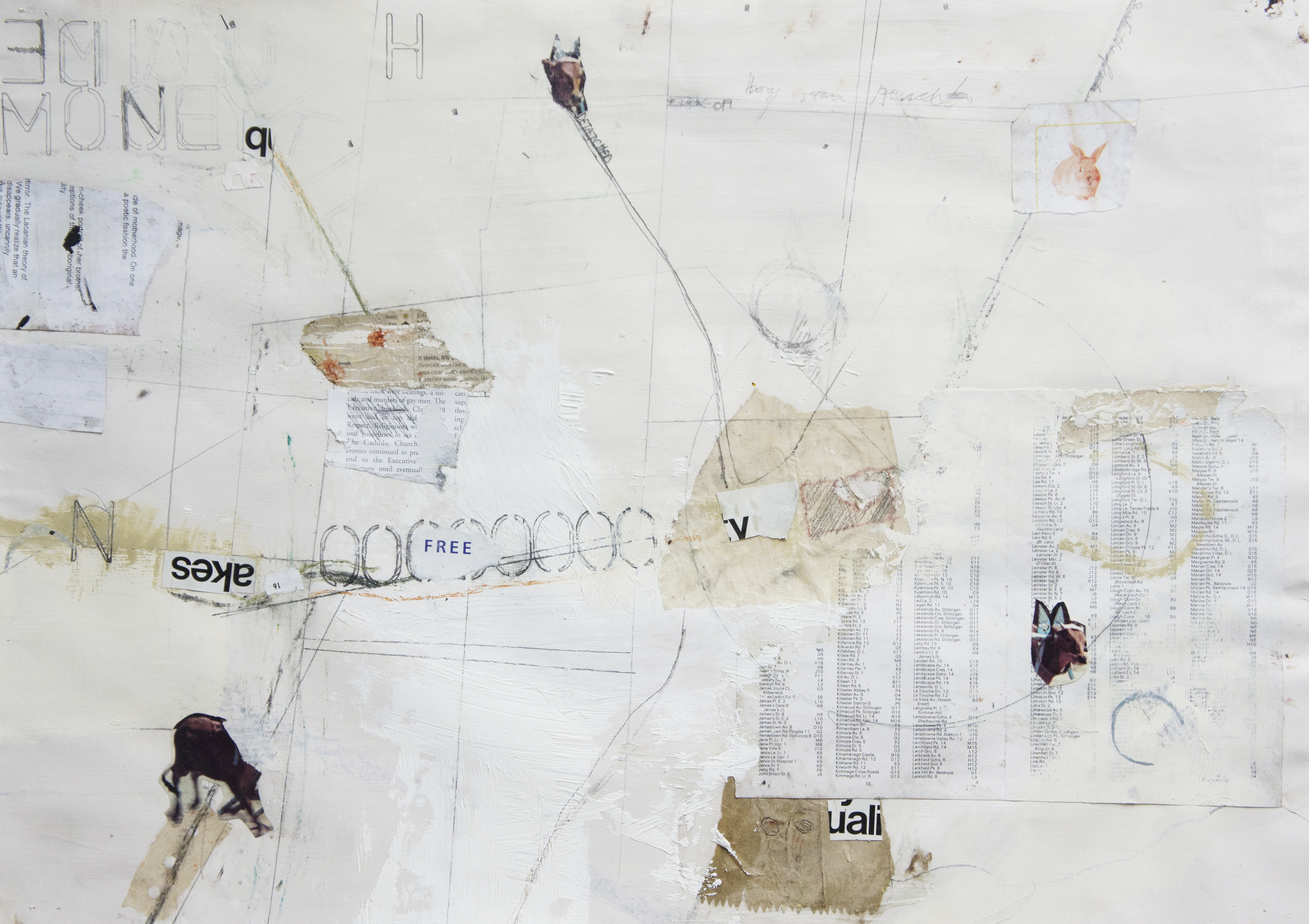 This piece dates from 2009. The bull heads and headless body and the rabbit are quite surreal and humorous elements of the composition, which could be interpreted as symbolic of (impotent) strength and weakness. It is deliberately left open to interpretation. Everyday materials like the piece of the brown paper bag, grease proof paper and the torn piece of foolscap were employed alongside the fragments of text.