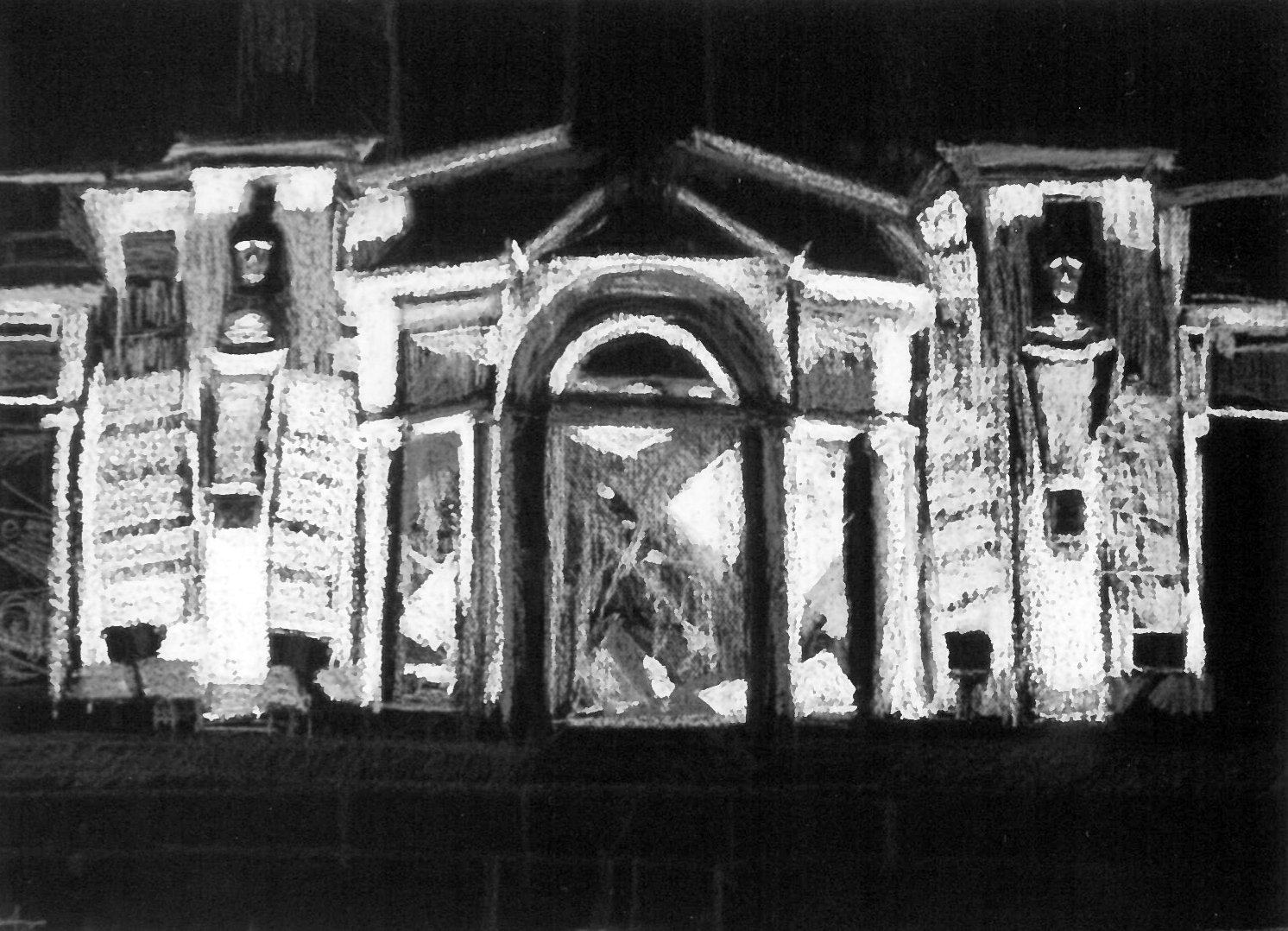 This piece is from around the same time as Cathedral. It is quite a loose study from a photograph of a window in the landmark Robinson and Cleaver building in the centre of Belfast. I used white and grey crayon. I experimented by using black paper to try and heighten the drama and add to the night time feel. The white eyes of the carved heads are exaggerated for ominous effect.