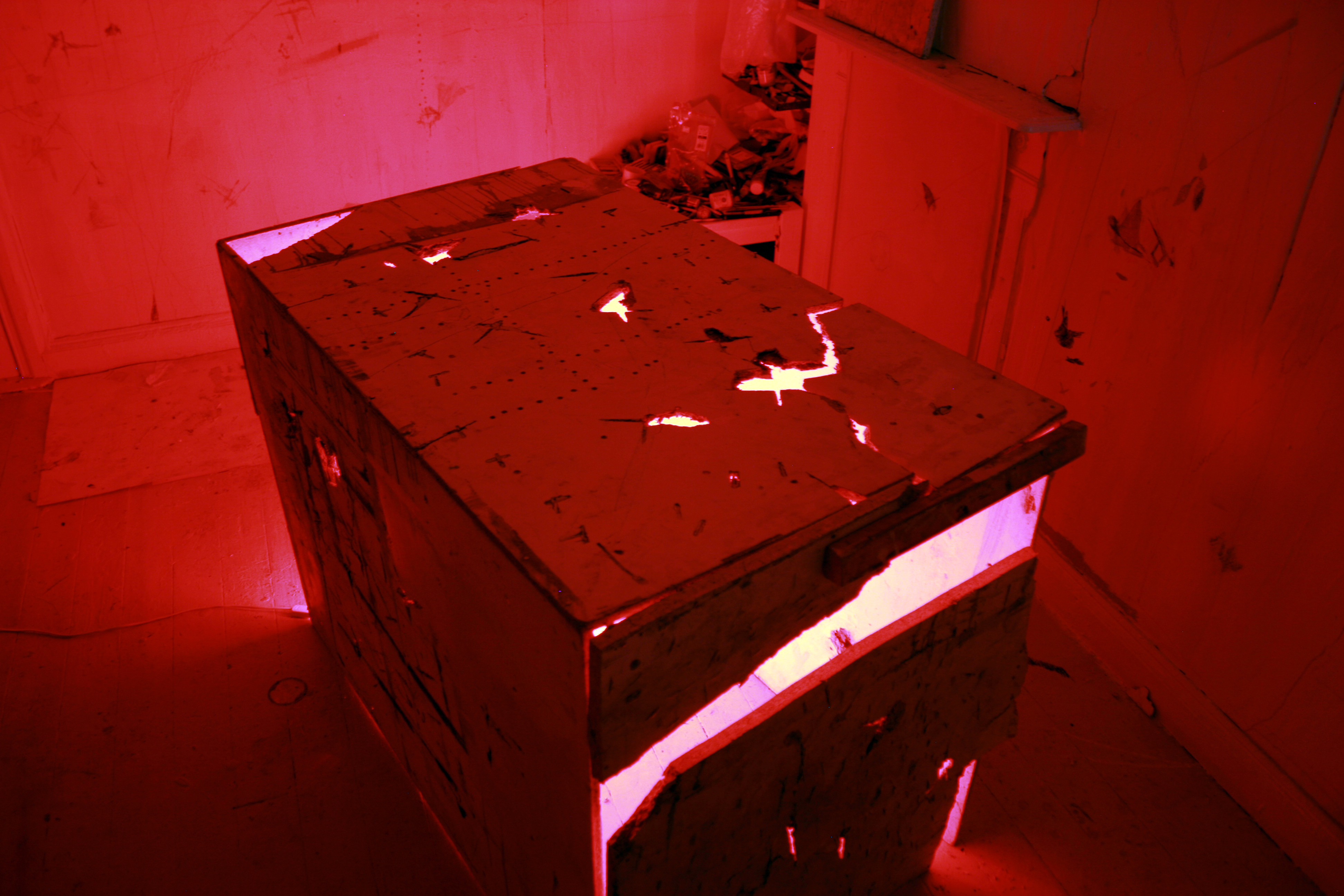 One red lamp and long exposures create the impression of the room being bathed in a red, somehow primordial glow.
