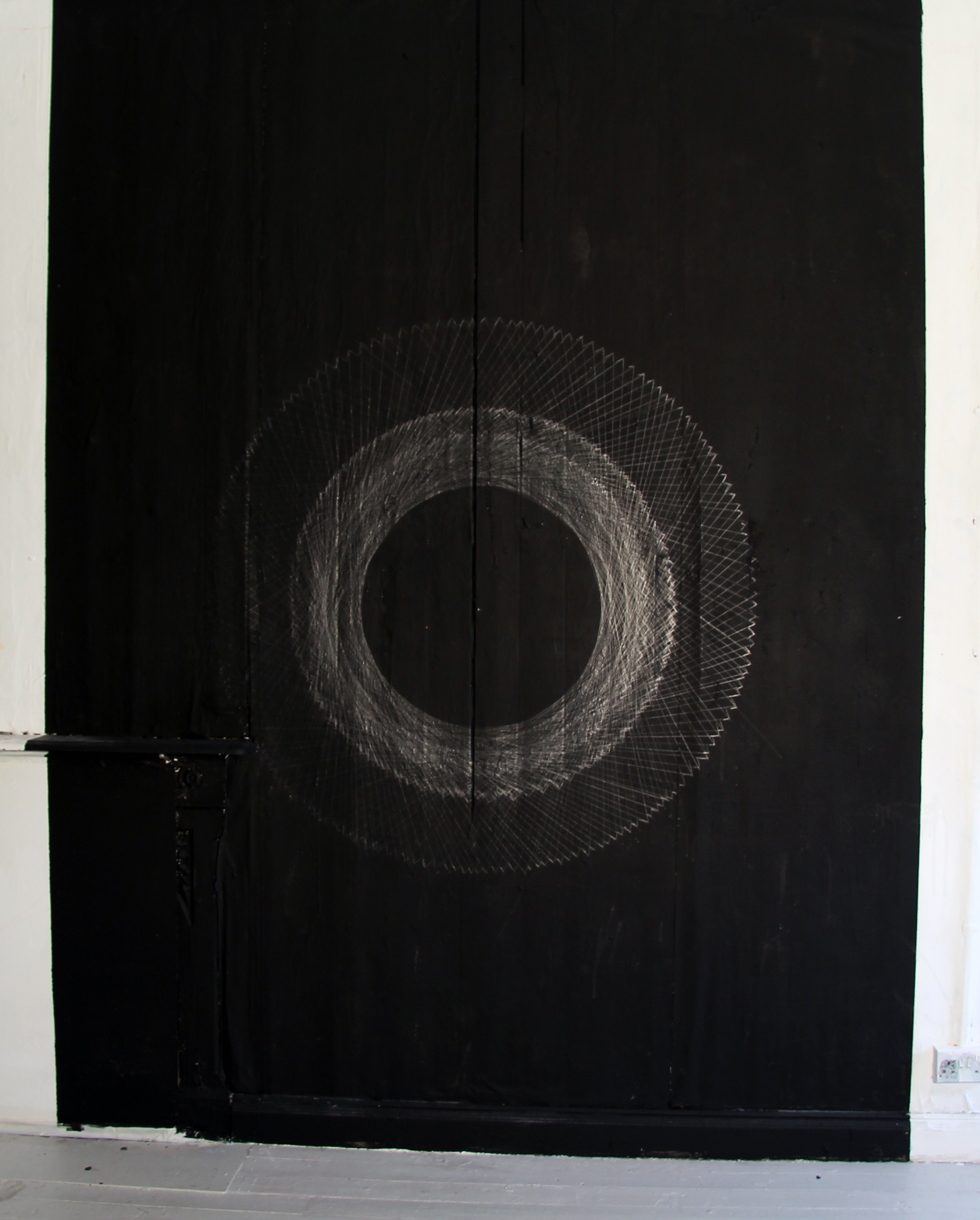 These wall drawings were rendered with pencil. It operates in a more subtle, elusive register than chalk. The viewer is forced to look closer and from different angles to discern the complete shape of the work.
