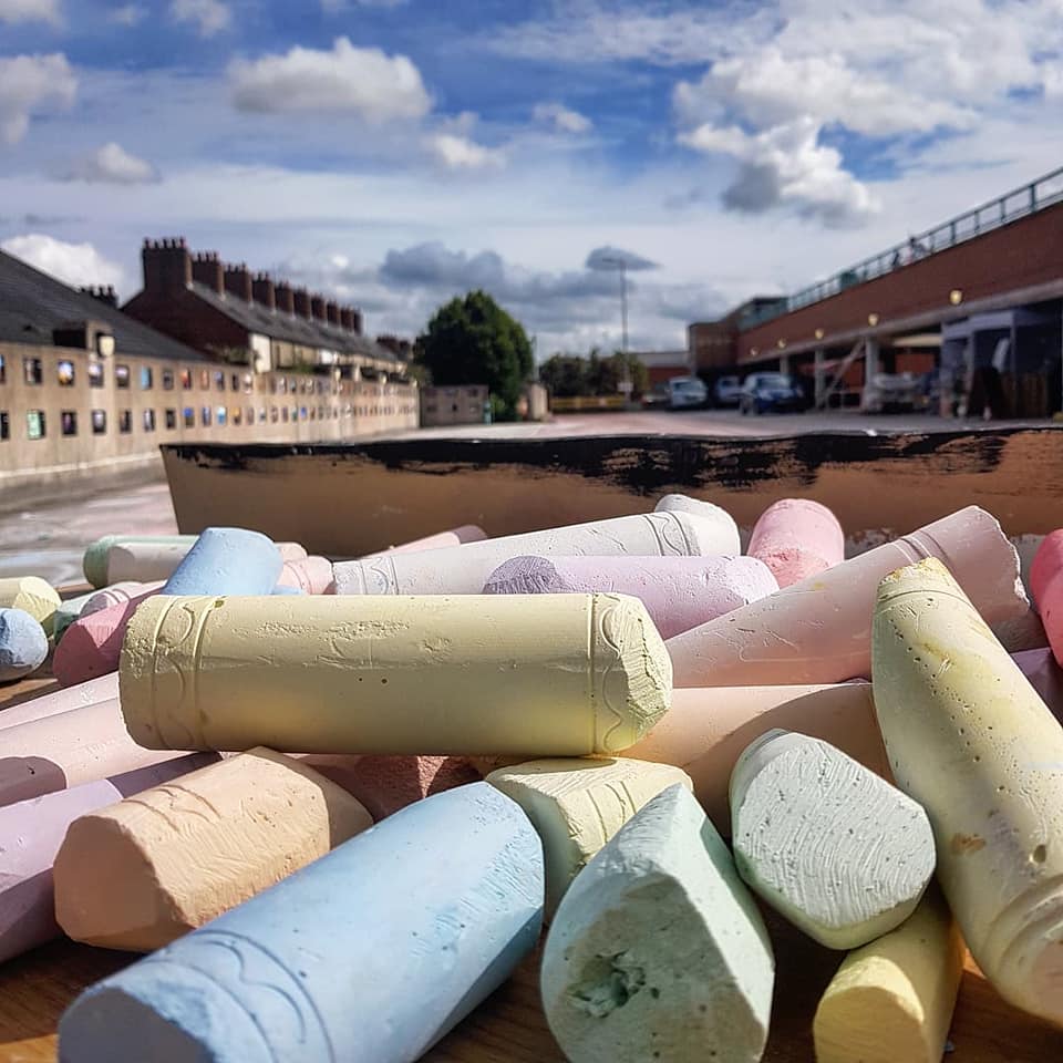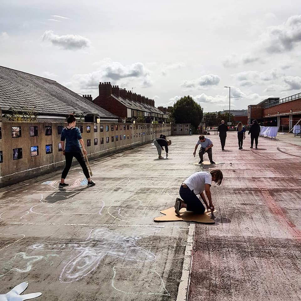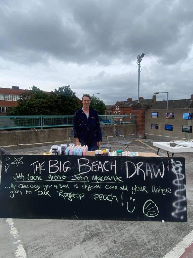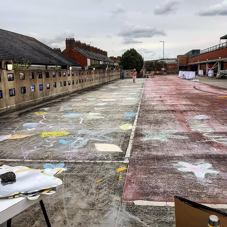 In August I collaborated with Platform Arts, Urban Scale Interventions and Connswater shopping centre to co-facilitate a large-scale community drawing workshop on the roof of the centre’s multi-storey car park with the theme ‘every grain of sand’ referencing how each individual person is unique and has a valuable contribution to make. The drawing was part of ‘Rooftop Summer Recess,’ part of the Eastside Arts Festival 2021 in Belfast.